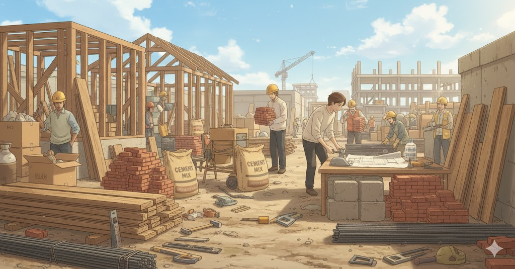 - 해석: 건물이나 구조물을 짓는 데 사용되는 목재, 콘크리트, 강철 등의 재료.