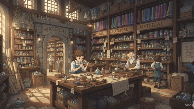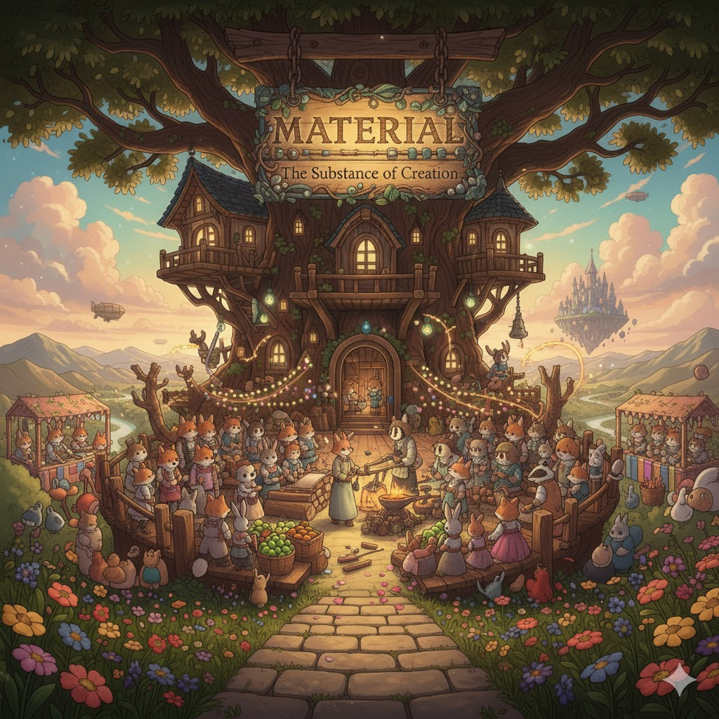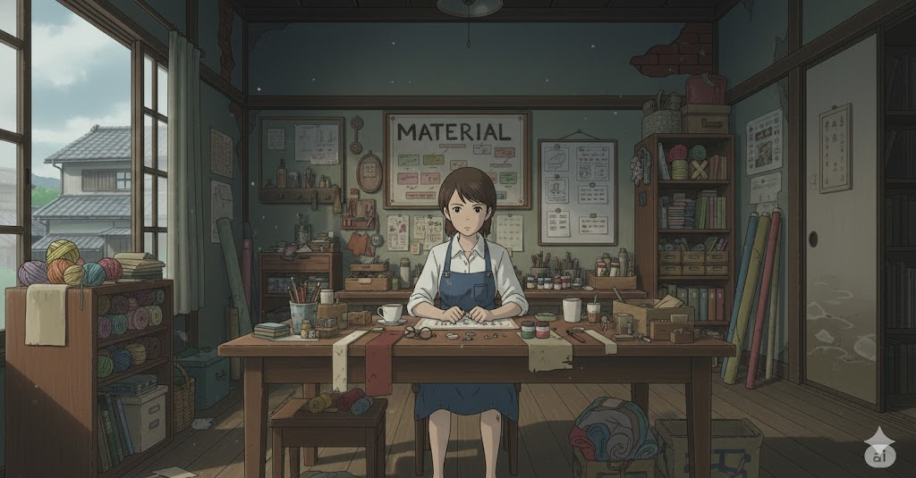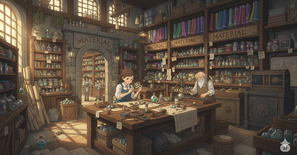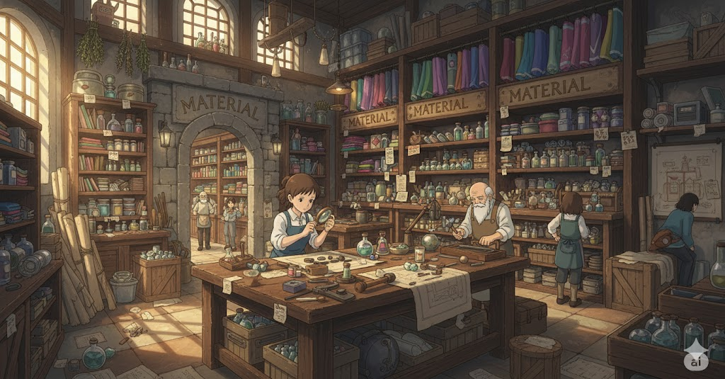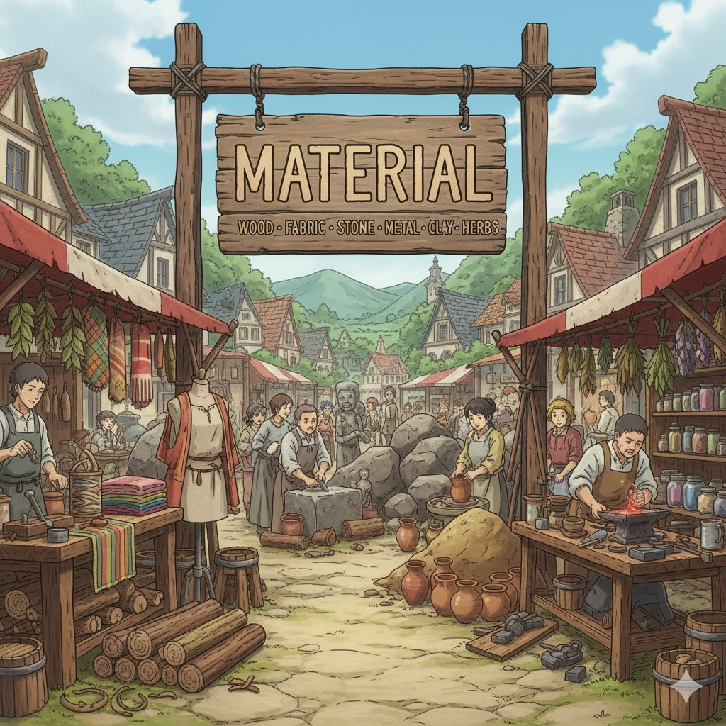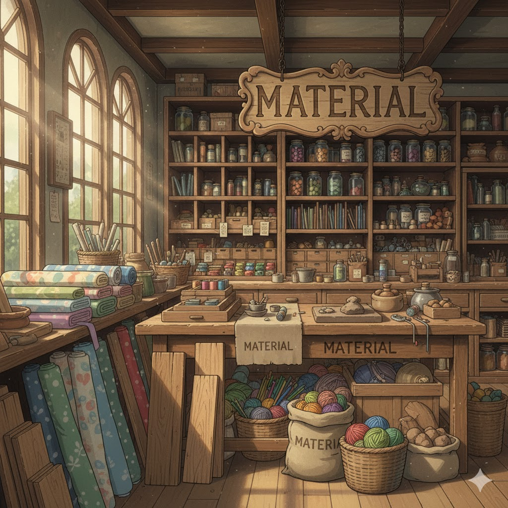 라틴어 māteria ("나무, 재료, 원료, 근원")에서 유래 → 구 프랑스어 materiel을 거쳐 영어로 유입 → 즉, 원래 **'어떤 것을 만드는 데 필요한 물질적인 원료'**를 의미했음 → 이 의미가 현대 영어에서 '물건을 만들거나 구성하는 데 사용되는 원료나 성분' (재료, 물질) 명사로 굳어졌어요. 나아가 이러한 '구성 요소'라는 개념이 확장되어 '연구나 학습에 사용되는 정보나 근거' (자료, 정보)를 뜻하게 되었고, '옷 등을 만드는 직물' (천, 직물)의 의미를 가지게 되었어요.