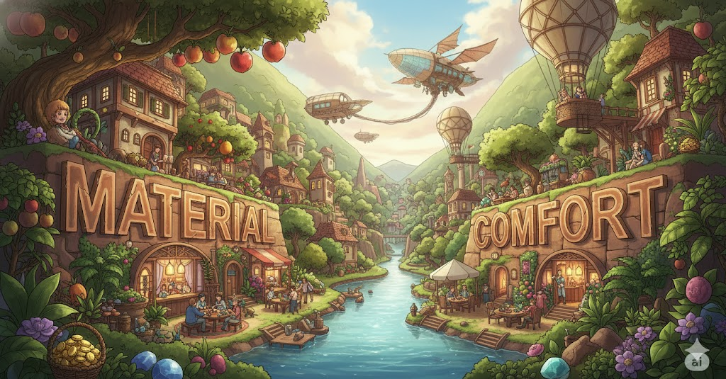 - 해석: 돈이나 소유물을 통해 얻는 신체적 안락함이나 풍요로운 생활. (비물질적 가치와 대비)