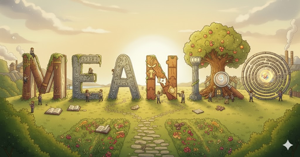 고대 영어 mǣnan ("의미하다, 의도하다") 동사에서 유래 → 게르만어 mainijan ("의미를 전달하다")와 관련 → 즉, 원래 '생각이나 개념을 표현하여 다른 사람에게 전달하는 것'을 의미했음 → 이 의미가 현대 영어에서 '단어, 기호, 행동 등이 나타내거나 전달하려는 생각이나 개념' (의미, 뜻) 명사로 굳어졌어요. 나아가 이러한 '표현하려는 것'이라는 개념이 확장되어 '어떤 행동이나 표현 뒤에 숨어 있는 계획이나 목표' (의도, 목적)를 뜻하게 되었고, '어떤 것이 가지고 있는 중요성이나 본질적인 가치' (중요성, 가치)의 의미로도 사용됩니다. 즉, '내포된 생각, 목적, 또는 본질적 가치'를 나타내는 핵심 명사예요.