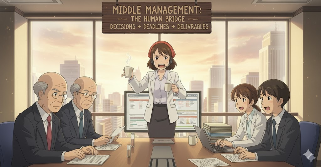 - 해석: 조직에서 최고 경영진과 일선 직원 사이에 위치하며, 전략을 실행하고 팀을 감독하는 관리자 계층.
