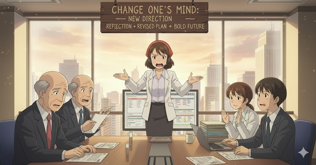 '이전에' '확정'(finalize)했던 '결정'(decision), '의견'(opinion), 또는 '계획'(plan)에 대해, '숙고'(consideration), '새로운 정보'(information), 또는 '설득'을 통해 '원래의 생각'(mind)을 '수정'(change)하는 행위를 의미합니다. 이는 '결단'의 '번복'(reverse a decision)에 초점이 맞춰져 있습니다.