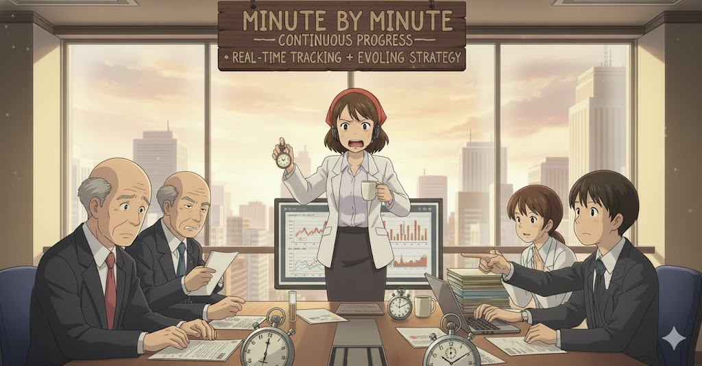 '매' '분'(minute) '단위'로 '시간'이 '흐름'에 따라, '상황'(situation)이나 '수치'가 '계속해서', '빠르게' '변화'(change)하고 있는 상태를 의미합니다. 이는 '지속적인' '관찰'(observation)과 '긴급성'(urgency)을 강조합니다.