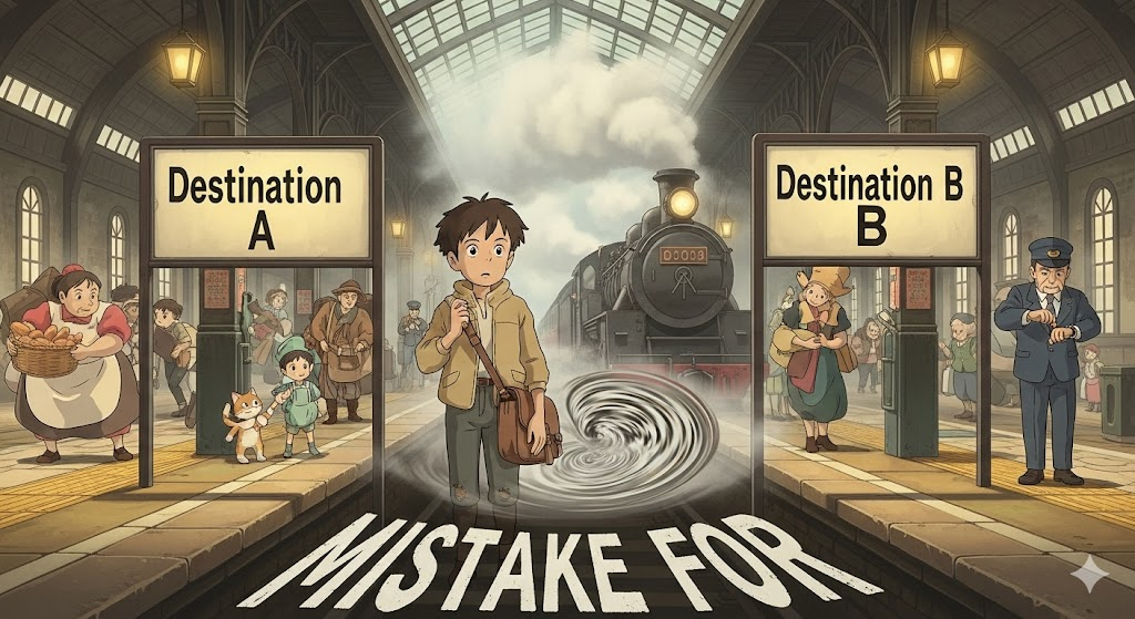 - 해석: 비슷하게 생겼거나 닮아서 어떤 대상을 다른 것으로 잘못 생각하거나 인식하다.
