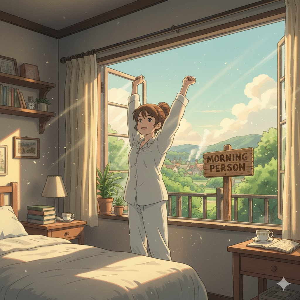 '이른' '아침'(morning) 시간대'에 '가장', '활력'(energy)이 넘치고, '생산적'이며, '기분'이 '좋은' '사람'(person)을 의미합니다. 이는 '늦게' '활동'하는 '저녁형' '인간'(night owl)과 대비되는 '개인의' '생체' '리듬'(circadian rhythm) **특성'**에 초점이 맞춰져 있습니다.