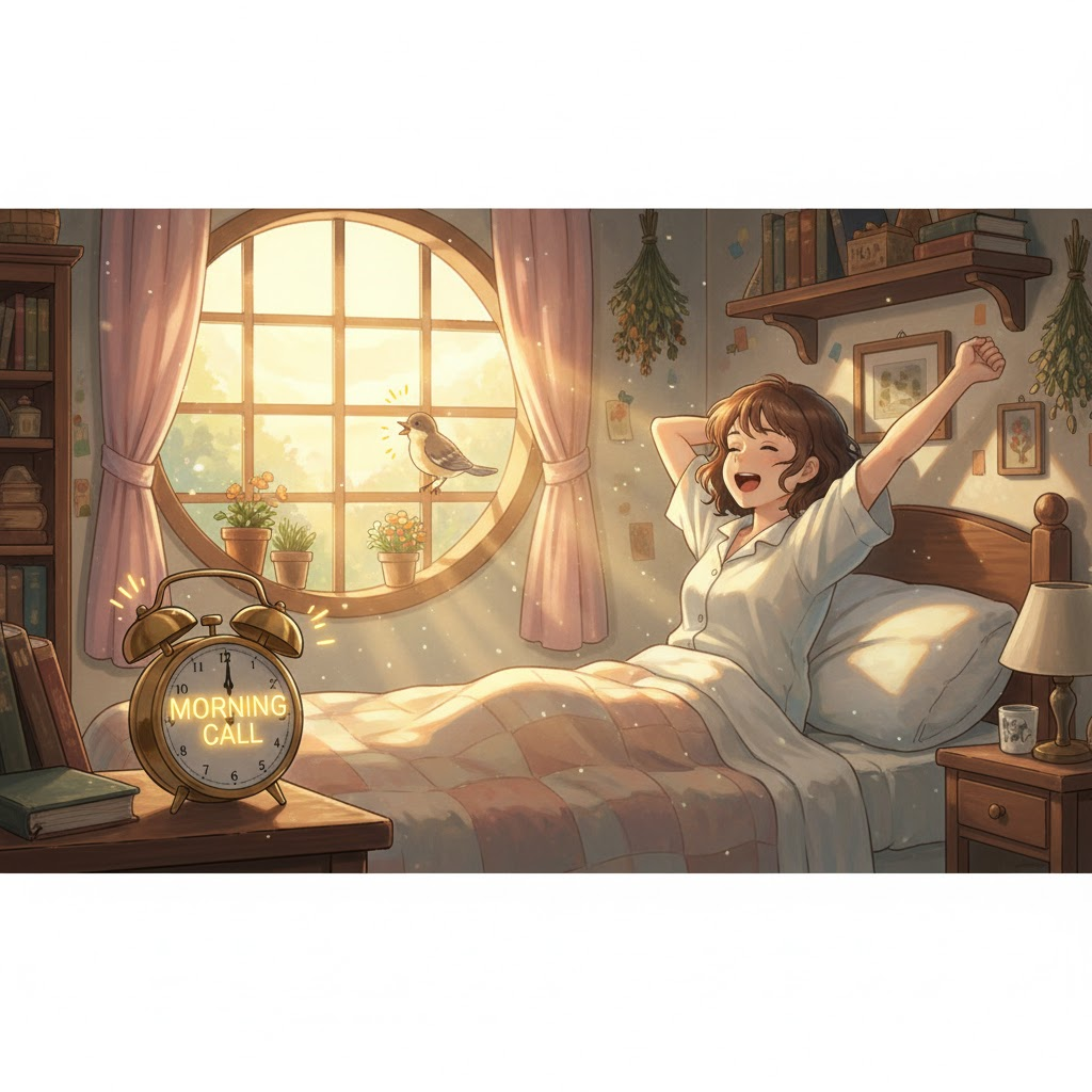 '이른' '아침'(morning)에 '잠'에서 '깨어나', '하루'(day) 일과'를 '시작'하도록 '돕기'(help) 위해 '호텔'(hotel) 등에서 '제공'하는 '전화'(call) 서비스를 의미합니다. 이는 '시간'(time) **관리'**와 '편의성'(convenience)에 초점이 맞춰져 있습니다.