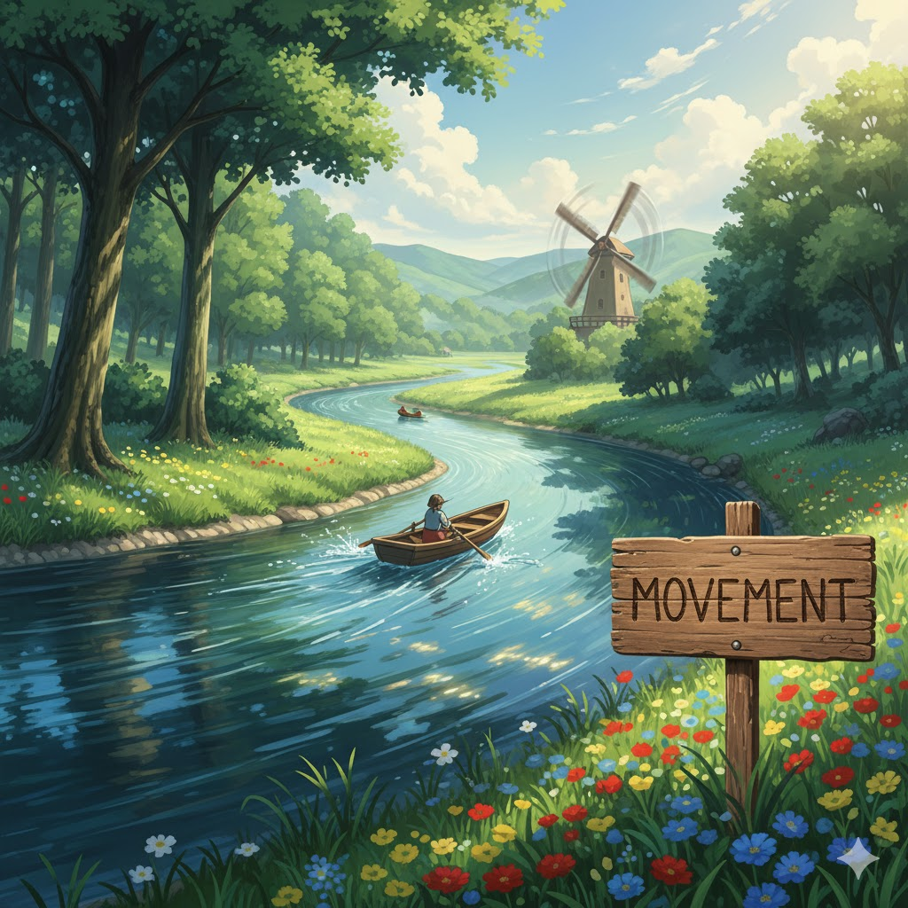 라틴어 movere ("움직이다")에서 유래 → 라틴어 movimentum ("움직임")을 거쳐 구 프랑스어 mouvement를 통해 영어로 유입 → 즉, 원래 **'위치나 상태가 변화하는 것'**을 의미했음 → 이 의미가 현대 영어에서 '물체나 사람이 위치를 바꾸는 물리적인 행위' (움직임, 동작) 명사로 굳어졌어요. 나아가 이러한 '움직이는 힘'이라는 개념이 확장되어 '사회적, 정치적 변화를 위한 조직적인 활동' (운동, 단체)을 뜻하게 되었고, '상황이나 시장 등이 변화하는 일반적인 경향' (동향, 추세)의 의미를 가지게 되었어요. 음악에서는 '독립적인 움직임'이라는 비유적 의미에서 **'악장'**으로도 사용됩니다. 즉, **'물리적 변화, 집단 행동, 또는 변화의 경향'**을 나타내는 핵심 다의어예요.