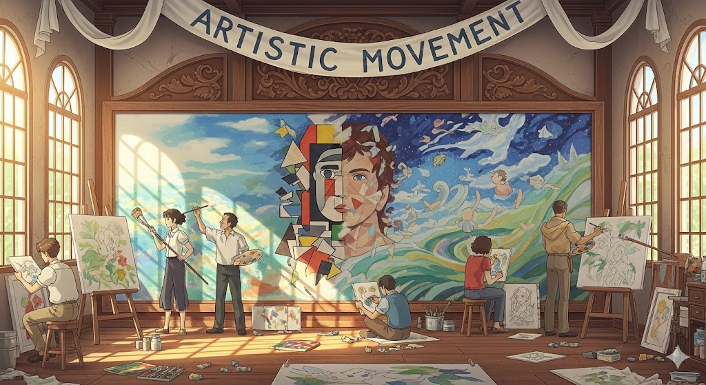 '특정' '기간'(time) 동안 '예술가'(artist)들이 '공통'의 '스타일', '철학', 또는 '목표'(purpose)를 공유하며 '추구'했던 '예술'(art) 경향'을 의미합니다. 이는 '표현'(expression) 방식의 '변화'(change)와 '창조성'(creativity)에 초점이 맞춰져 있습니다.