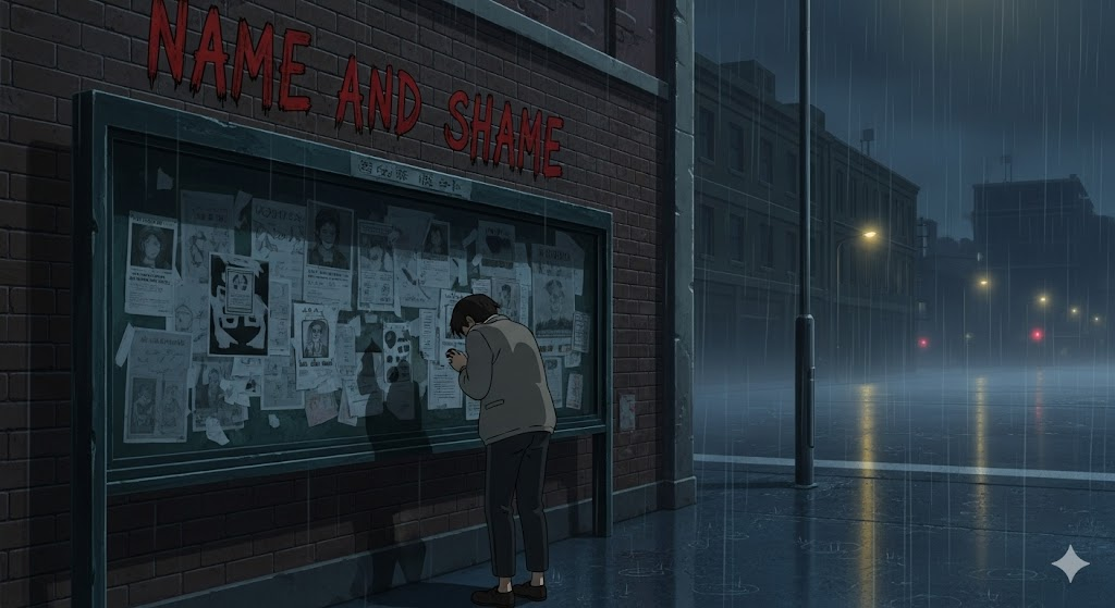 '규칙'(rule), '법률'(law), 또는 '도덕'을 '위반'한 '사람'(person)이나 '조직'의 '이름'(name)을 '공개적'으로 '밝혀', '비난'(criticism)하고 '수치'(shame)를 '주려는' 행위를 의미합니다. 이는 '잘못'에 대한 '책임'(responsibility) 강조'와 '재발'(recurrence) 방지'(prevention)를 목표로 합니다.