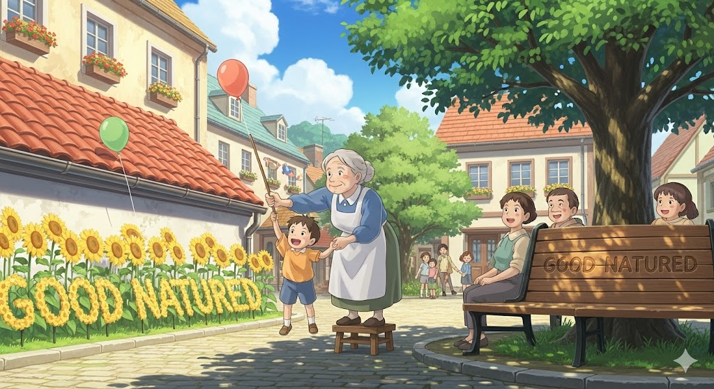 | good natured | 성품이 착한 | 형용사로, '성격'. | '타고난' '성격' '이' '친절' '하고' '온순' '함' '을' '강조함'. |