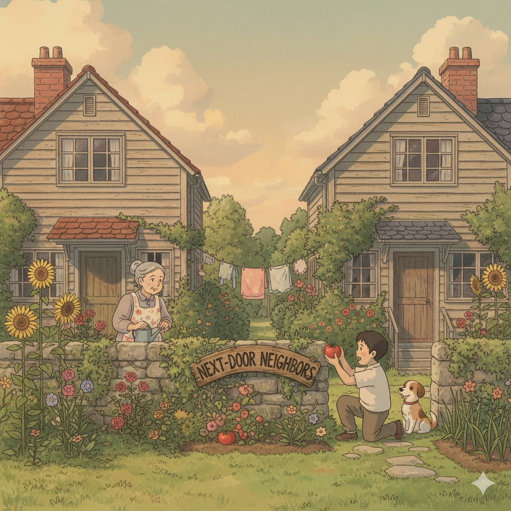 - 예문: Our next-door neighbor often borrows tools and shares fresh vegetables from her garden. (우리 바로 옆집 이웃은 종종 도구를 빌려주고 정원에서 딴 신선한 채소를 나눠준다.)