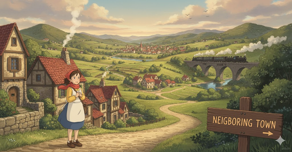 - 해석: 가까운 거리에 위치한 다른 마을이나 소도시.