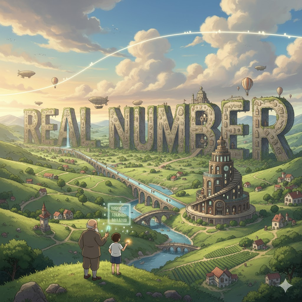 '유리수'(rational number)와 '무리수'(irrational number)를 '모두' '포함'하는, '실제' '존재' (existence)하거나 '측정'(measure) 가능한 '모든' '숫자' (number)를 의미하는 '수학적'(mathematical) '개념'입니다. '수직선' (number line) 위의 '모든' '점'을 나타낼 수 있습니다.