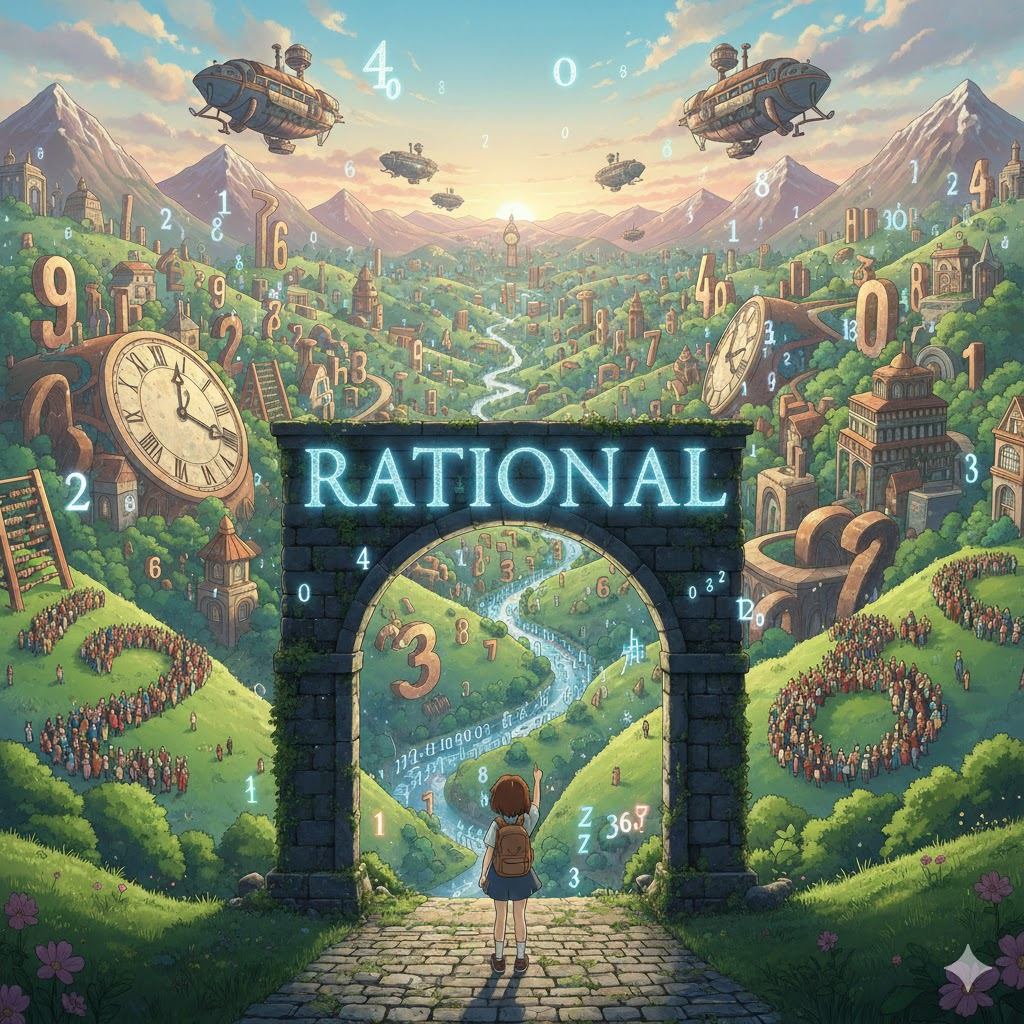 '분수' (fraction) 형태 (p/q, 단, q≠0)로 '나타낼' 수 있는 '숫자' (number)를 의미하는 '수학적'(mathematical) '용어'입니다. '정수'(integer)와 '분수'를 포괄하며, '실수'(real number) 범위' 안의 '일부'를 구성합니다.
