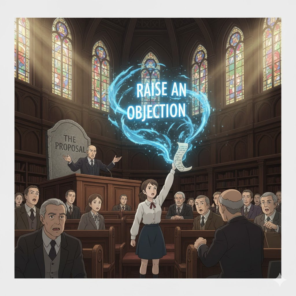'회의'(meeting), '토론'(discussion), 또는 '법정'(court) 등의 '공식적'(official) 상황'에서, '특정' '진술', '결정'(decision), 또는 '절차'에 대해, '반대' (opposition) 의사'를 '명시적', 혹은 '공식적'으로 '표현'(expression)하는 행위를 의미합니다. 이는 '불만'(complaint) 제기나 '합리적인'(rational) 문제'(problem) 제시에 초점이 맞춰집니다.