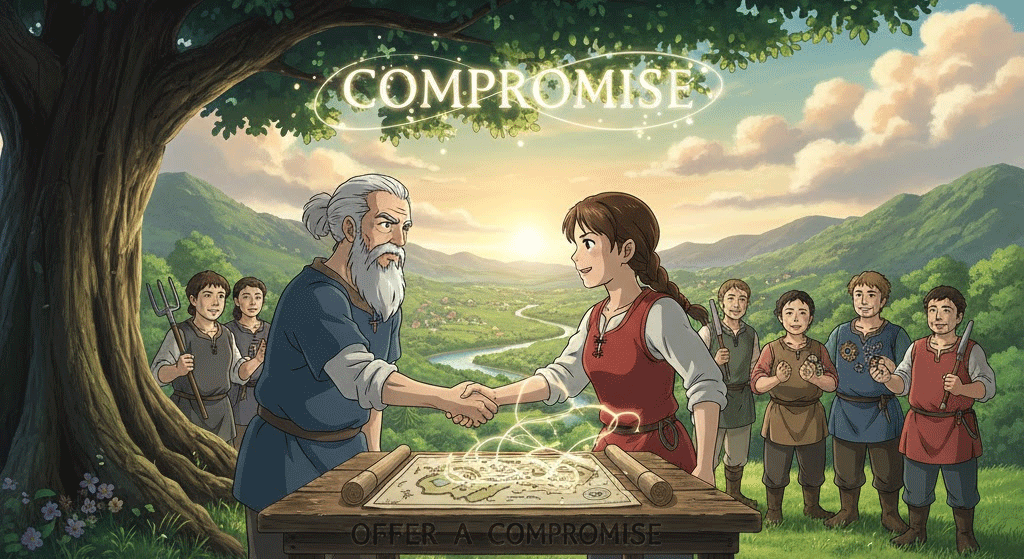 offer a compromise는 협상 지문에서 이성적이고 건설적인 갈등 해결 방식으로 다뤄집니다. 어느 한쪽의 일방적인 승리가 아닌, 상호 양보를 통해 **최적의 결과(Optimal Outcome)**를 도출하는 전략의 중요성이 강조됩니다.