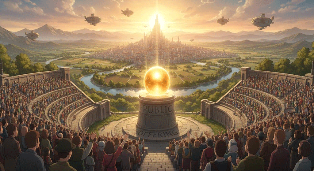 '회사' **(company)**가 '자신의' '주식' **(shares)**이나 **'증권'(securities)**을 '일반' '대중' **(public)**에게 **'판매'(sales)**하기 위해 '처음'(first) 으로 '제시'(offer)하는 행위를 의미합니다. '투자'(investment) 자본'(capital) 확보 및 '상장'(listing) 절차에 초점이 맞춰집니다.