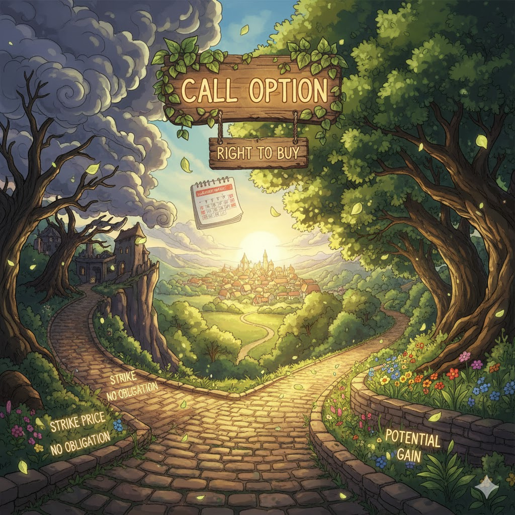 '특정'(specific) '자산'(asset), '상품'(goods), 또는 '부동산'(real estate)을 '미리'(advance) '정해진'(set) '가격'(price)과 '조건'(terms)으로 '구매'(purchase)할 수 있는 '권리'(option)를 의미합니다. '계약'(contract) 상의 '권리'로, '의무'(duty)가 아닌 '선택'(choice)을 보장합니다.