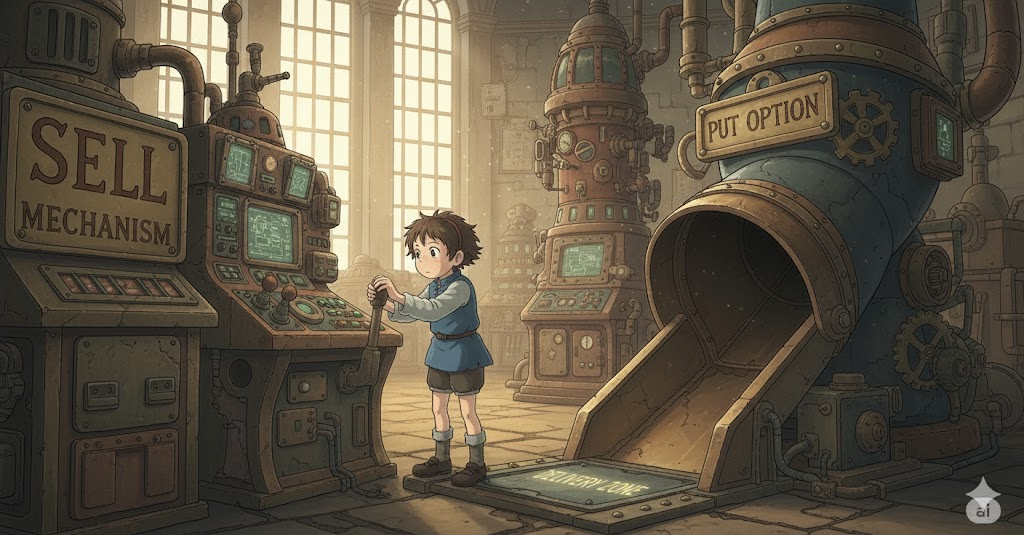 '특정'(specific) '자산'(asset) (예: 주식)을 '미리'(advance) '정해진'(set) '가격'(price)으로 '정해진' '시점'(time)에 '팔'(put) 수 있는 '권리'(option)를 의미합니다. '금융'(financial) '시장'(market)에서 '하락'(drop) '위험'(risk)을 '방지'(prevent)하기 위한 '보험'(insurance)과 같은 '기능'(function)을 수행합니다.