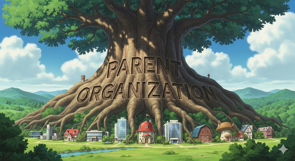 - 해석: 다른 조직이나 자회사를 소유하고 통제하며 감독하는 가장 상위에 있는 주된 조직.