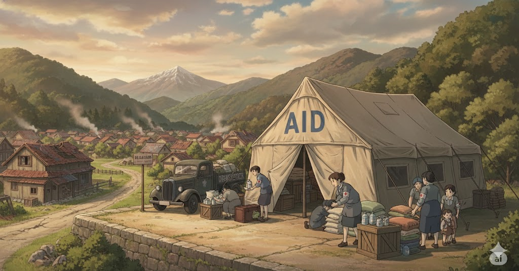 - 해석: 재난이나 빈곤으로 어려움을 겪는 사람들에게 물품, 의료, 재정적 지원을 제공하는 인도주의적 조직.