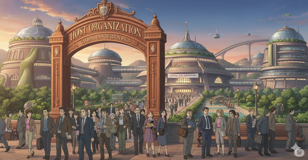 '회의'(conference), '행사'(event), '훈련'(training) 프로그램, 또는 '학생'(student) '교환'(exchange) 등의 '활동'(activity)을 '공식적으로'(officially) '계획'(plan), '준비'(prepare), 그리고 '주관'(host)하는 '조직'(organization)을 의미합니다. '책임'(responsibility) 있는 '주최' 및 '손님'(guest) '접대'(receive) 역할에 초점이 맞춰집니다.