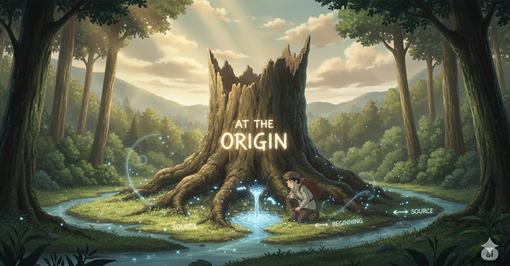 - (명사) 기원, 근원: 어떤 것이 처음으로 생겨나거나 시작된 지점, 장소, 또는 시간.