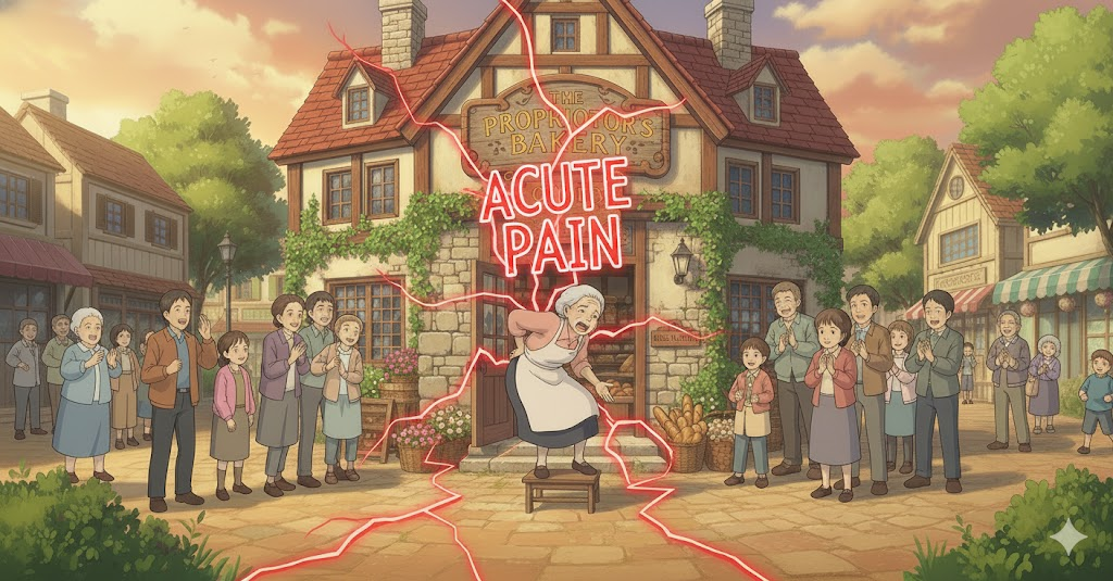'갑자기'(suddenly) **'시작'(start)**되어 **'심각'(serious)**하거나 '강렬'하지만, '상대적'으로 '짧은'(short) '기간'(time) 동안 '지속'되는 '신체적'(physical) **'고통'(pain)**을 의미합니다. **'손상'(damage)**이나 **'질병'(disease)**의 '즉각적인'(immediate) **'징후'(sign)**로, '만성'(chronic) 통증과 대비됩니다.