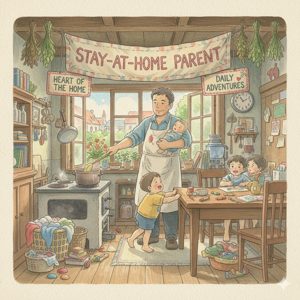 - 해석: 직장 생활을 하지 않고 집에서 자녀 양육과 가사에 전념하는 부모.