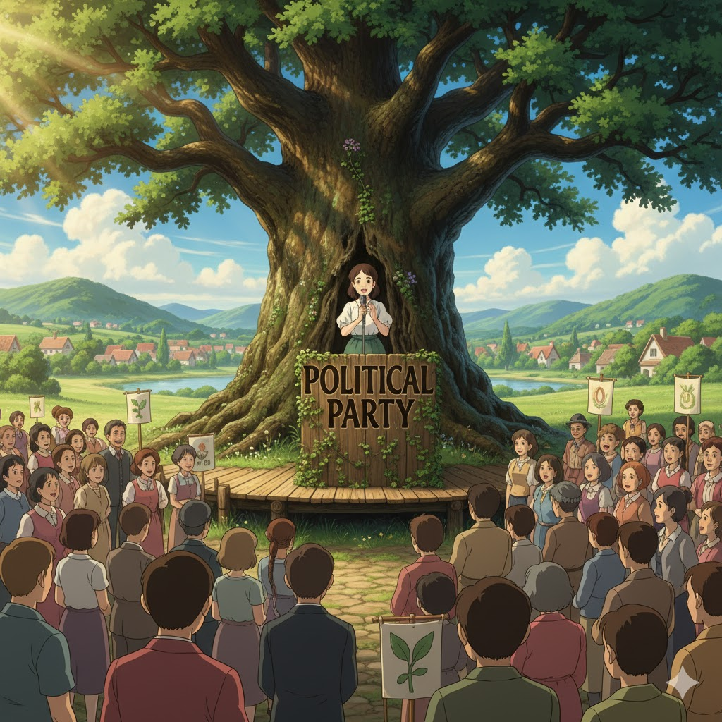 공통된(common) '정치적'(political) '신념'(faith), '목표'(goal), 또는 '강령'을 **'공유'(share)**하며, **'선거'(election)**를 통해 '정부'(government) 의 **'권력'(power)**을 **'획득'(acquire)**하거나 **'영향력'(influence)**을 행사'하려는 **'조직화'(organization)**된 **'집단'**을 의미합니다. '국가'(nation) 정책과 '리더십'(leadership) 확보에 초점이 맞춰집니다.