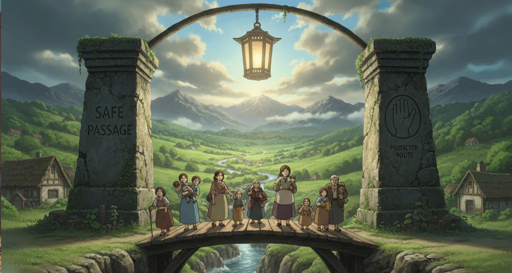 - 예문: During the conflict, a humanitarian corridor was established to allow safe passage for refugees. (분쟁 동안, 난민들의 안전한 통행을 허용하기 위해 인도주의 통로가 개설되었다.)