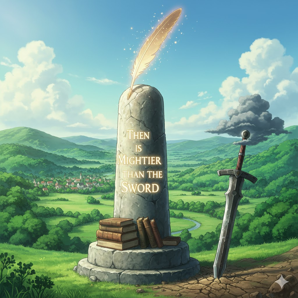 - 해석: 물리적인 폭력이나 무력보다 글이나 지식이 더 큰 영향력과 힘을 가진다는 격언. (언론, 사상의 중요성 강조)