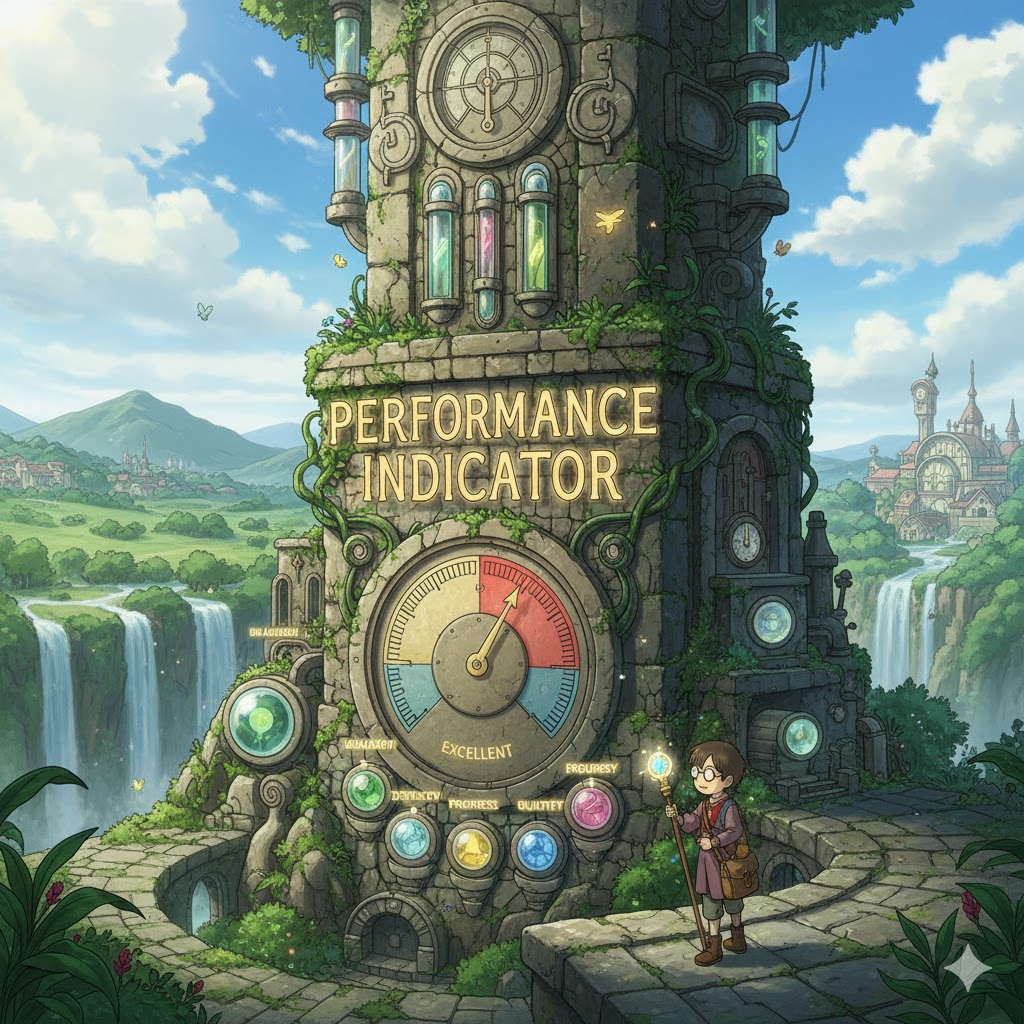 '개인'(individual), '팀'(team), 또는 '조직'(organization)이 '미리'(advance) '정의'(define)한 '목표'(goal)나 '전략'(strategy)을 '얼마나'(how well) '성공적'(successful)으로 '달성'(achieve)했는지 '측정'(measure)하는 데 '사용'(use)되는 '정량적'(quantitative) '측정'(measure) 기준(indicator)을 의미합니다. '효율성'(efficiency)과 '전략적'(strategic) '목표'(goal) '달성' '여부'를 강조합니다.