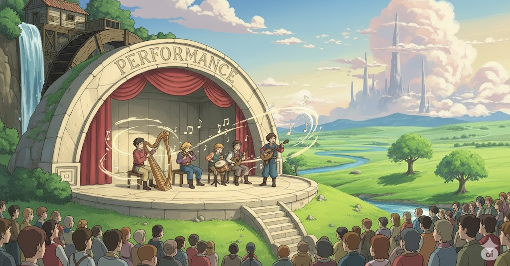 - (명사) 공연, 연주: 대중 앞에서 연기, 음악, 춤 등을 선보이는 행위.