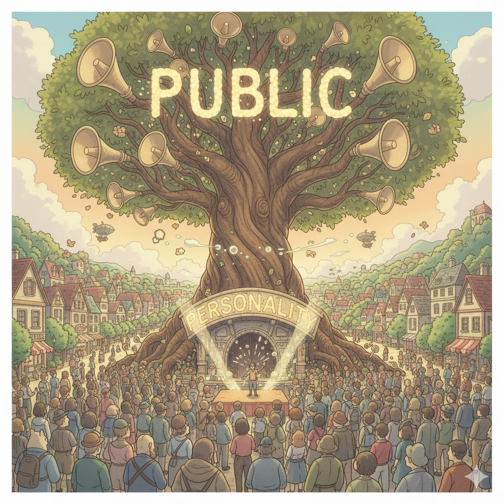 '유명인'(celebrity), '정치인'(politician), 또는 '공인'(public figure)과 같이 '대중'(public)에게 '노출'(exposure)되어 '매체'(media)를 통해 '알려진'(known) '공적인'(public) '이미지'(image)나 '성격'(personality)을 의미합니다. '사생활'(private)이 '제한'(limit)되고, '외부' '평가'(assessment)에 민감한 '지위'(status)를 강조합니다.