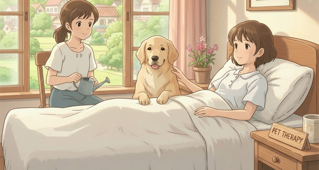 - 해석: 동물과의 상호작용을 통해 정신적, 신체적 건강을 증진시키는 치료 방식 (동물 매개 치료).