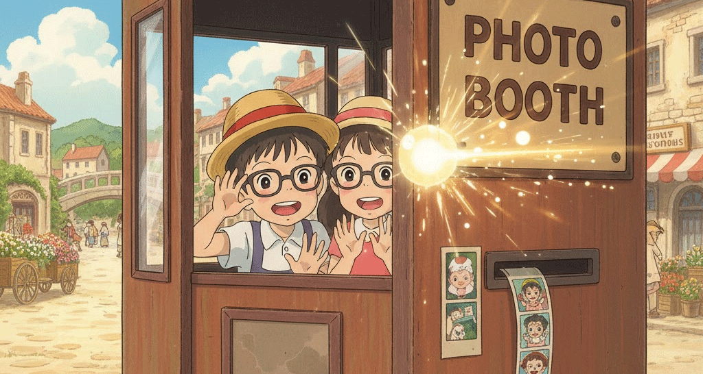 '동전'(coin)이나 '카드'를 '넣어'(insert) '결제'(payment)하면, '앉아서' '자동적으로'(automatically) '작은'(small) '사진'(photo)을 '찍고'(take a photo) '인화'(print)해 주는 '기계'(machine)가 '있는' '작은'(small) '공간'(space)을 의미합니다. '기념'(souvenir) 사진이나 '증명'(identification) 사진을 '신속하게'(quickly) '획득'(acquire)하는 데 초점이 맞춰집니다.