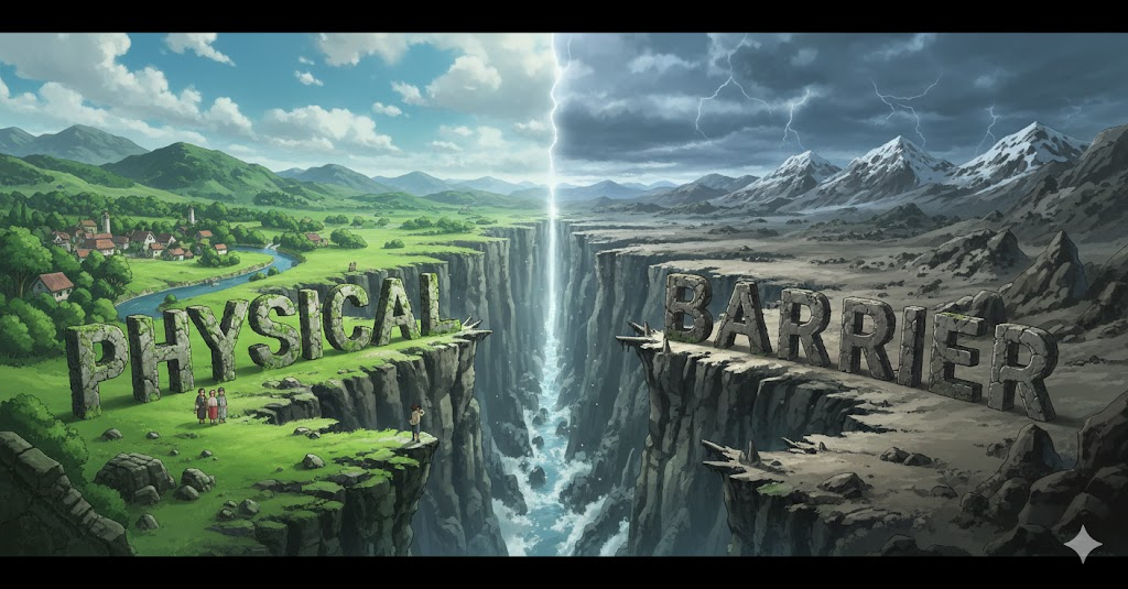 - 해석: 이동이나 접근을 실제로 가로막는 구체적이고 유형의 장애물 (예: 벽, 울타리, 산). (추상적 장벽과 대비)