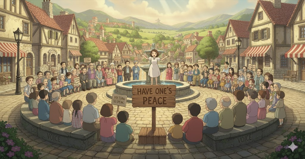 '토론'(discussion)이나 '회의'(meeting)에서 '다른' 사람들(people)의 '방해'(interruption) 없이, '자신의'(one's) '의견'(opinion)이나 '견해'(viewpoint)를 '완전히'(completely) '표현'(express)하고 '전달'(convey)하는 행위를 의미합니다. '솔직함'(frankness)과 '발언'(speech) '권리'(right)를 강조합니다.