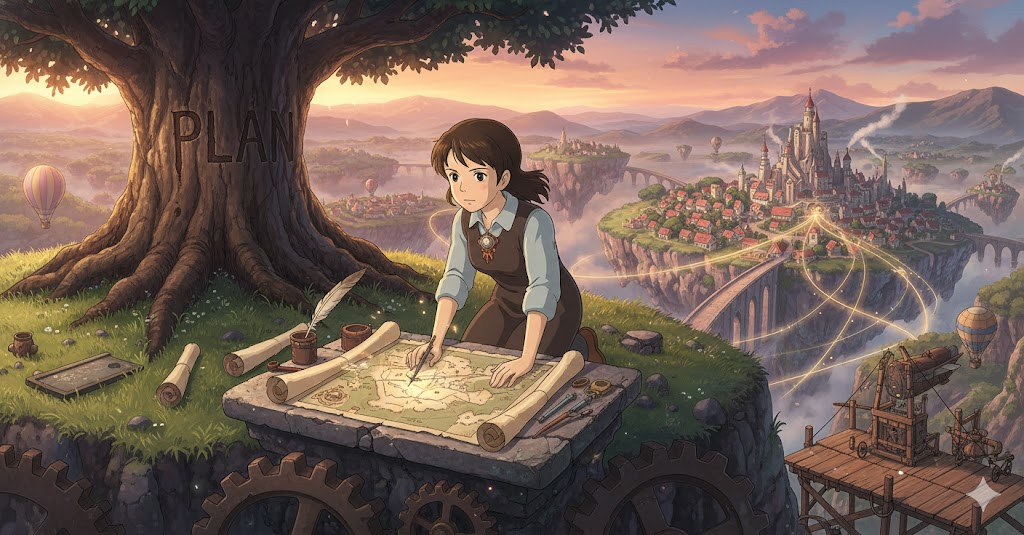 | plan | 라틴어 planus (평평한) → plana (평면도) | 복잡한 아이디어를 평면 위에 펼쳐서 체계화하는 구상. | '평면도' (시각적 구상) → '계획/구상' (미래 행동의 설계) → '계획하다' (구상을 실현하는 행위) → '~할 작정이다' (구체적인 의도) |