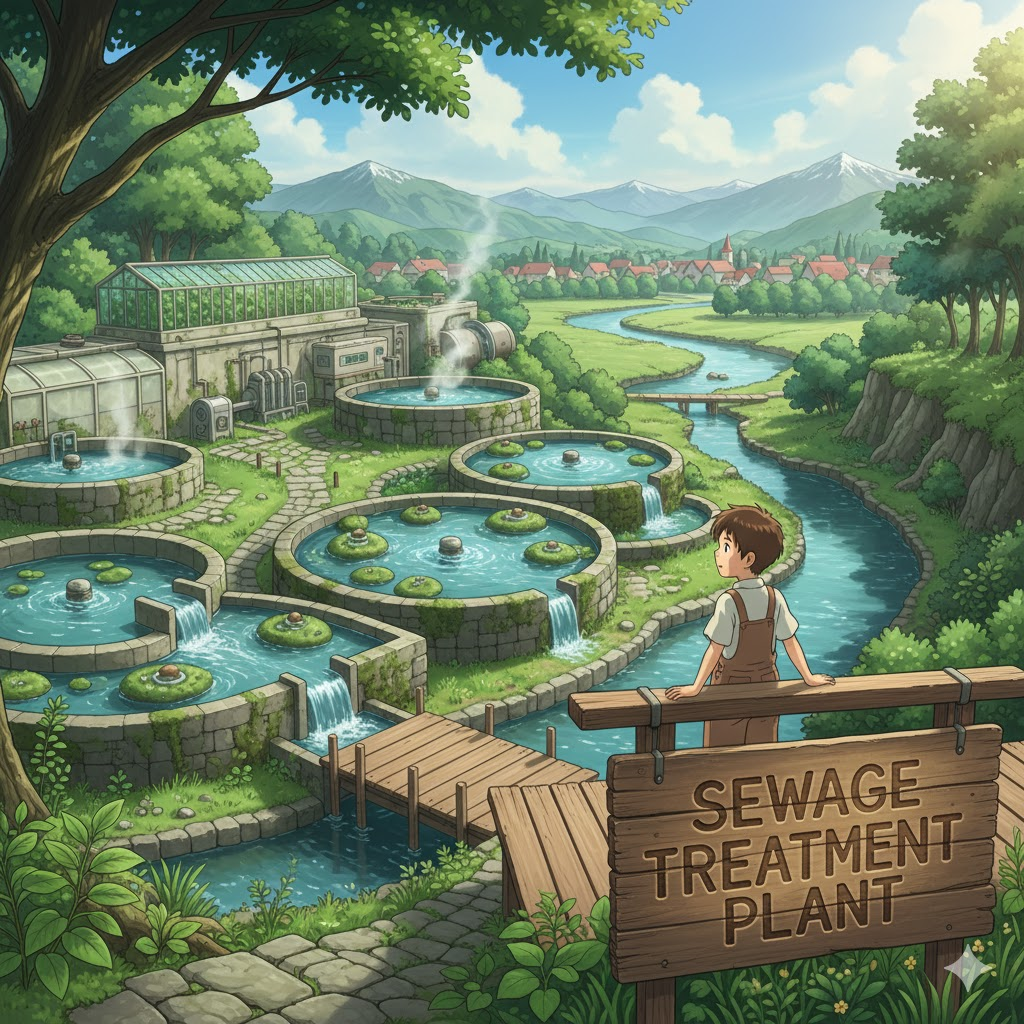 - 해석: 하수나 폐수를 정화하고 처리하여 환경으로 방출하기 전에 오염을 줄이는 시설.