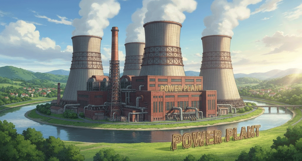 '연료'(fuel), '물'(water), 또는 '태양광'(solar power)과 같은 '자원'(resources)을 '사용'(use)하여 '전기'(electricity)나 '동력'(power)을 '생산'(production)하는 '산업'(industrial) '시설'(facility)을 의미합니다. '에너지'(energy) '공급'(supply)과 '운영'(operation) '효율성'(efficiency)에 초점이 맞춰집니다.