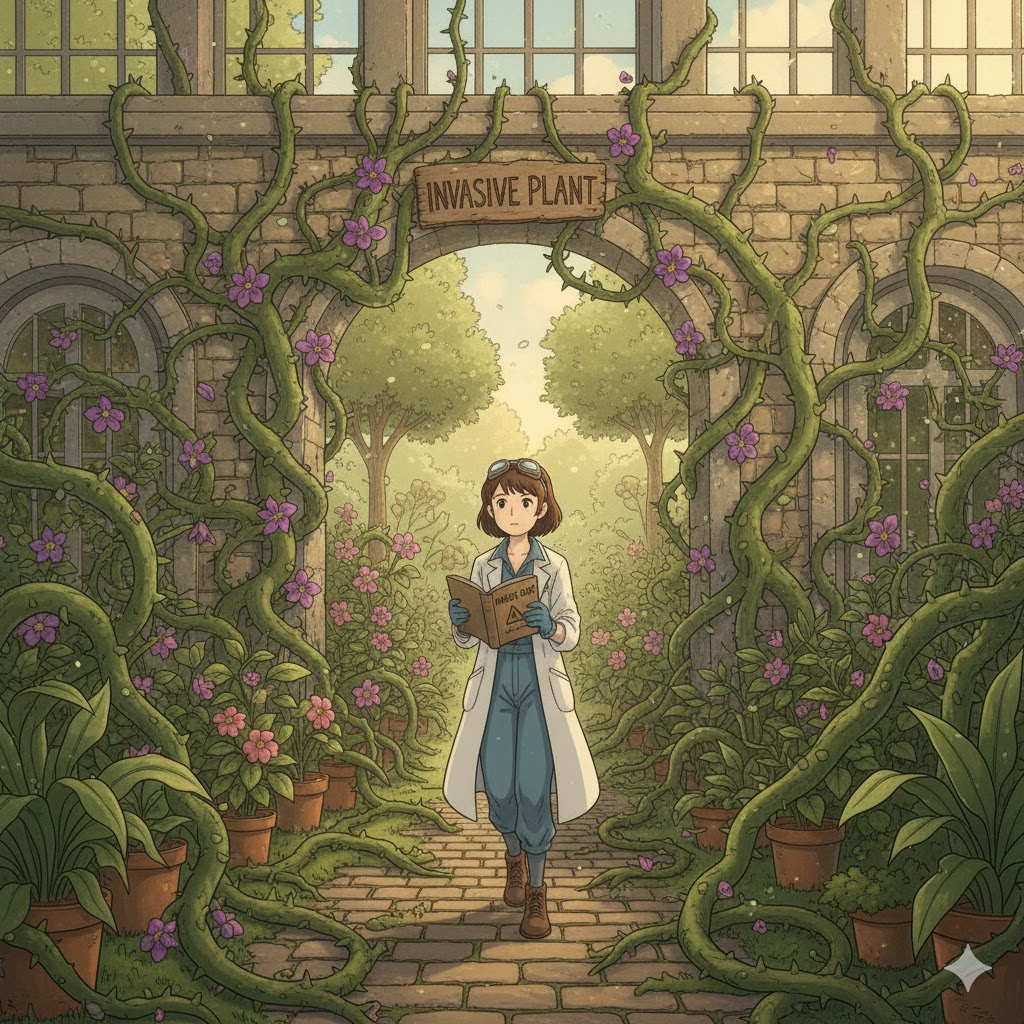 - 해석: 원래 서식지가 아닌 곳에 도입되어 토종 생태계에 해를 끼치는 식물.