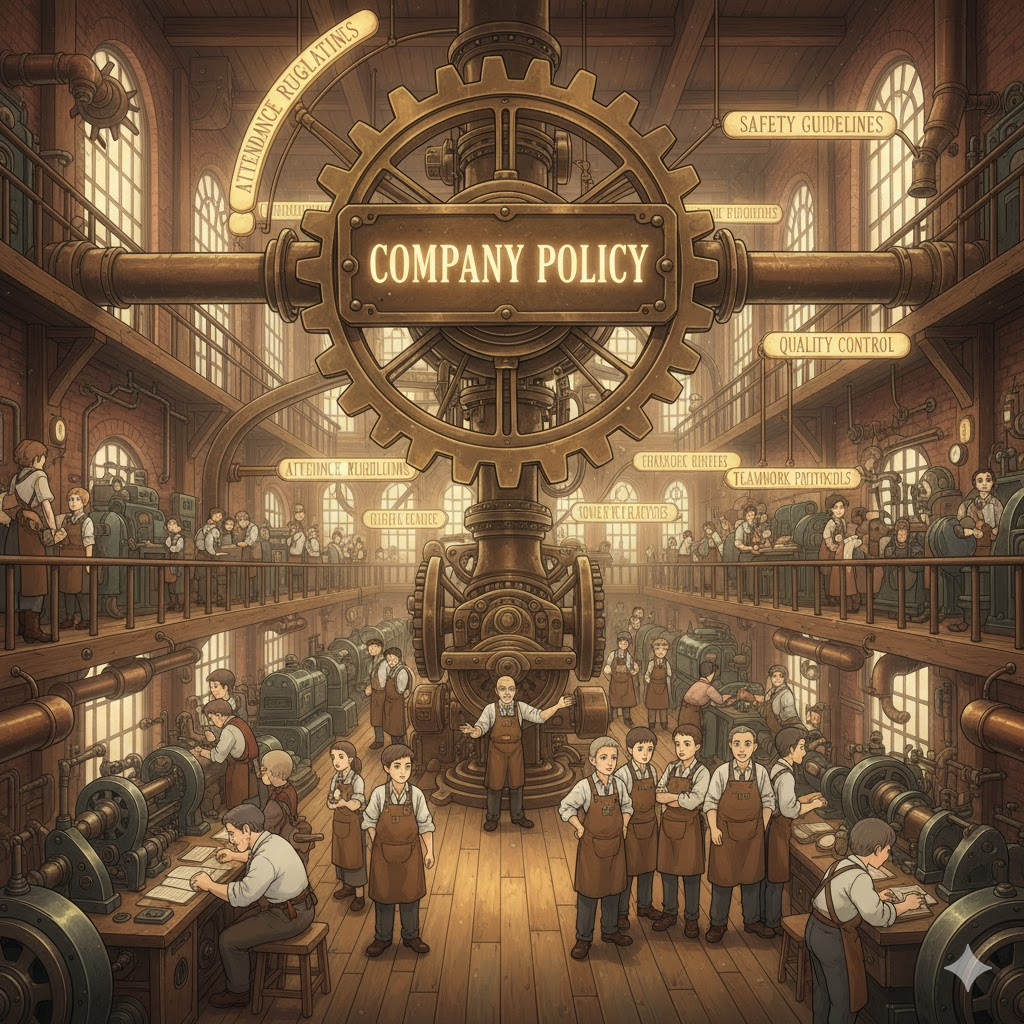 '회사'(company)나 '기업'(firm) '내부'(internal)의 '운영'(operation), '직원'(employee) '행동'(behavior), '규율'(discipline), '복리후생'(benefits), 그리고 '윤리'(ethics)에 관련된 '규칙'(rules)과 '절차'(process)를 '수립'(establish)한 '공식적인'(official) '방침'(policy)을 의미합니다. '조직'(organization) '문화'(culture)와 '일관성'(consistency)을 강조합니다.