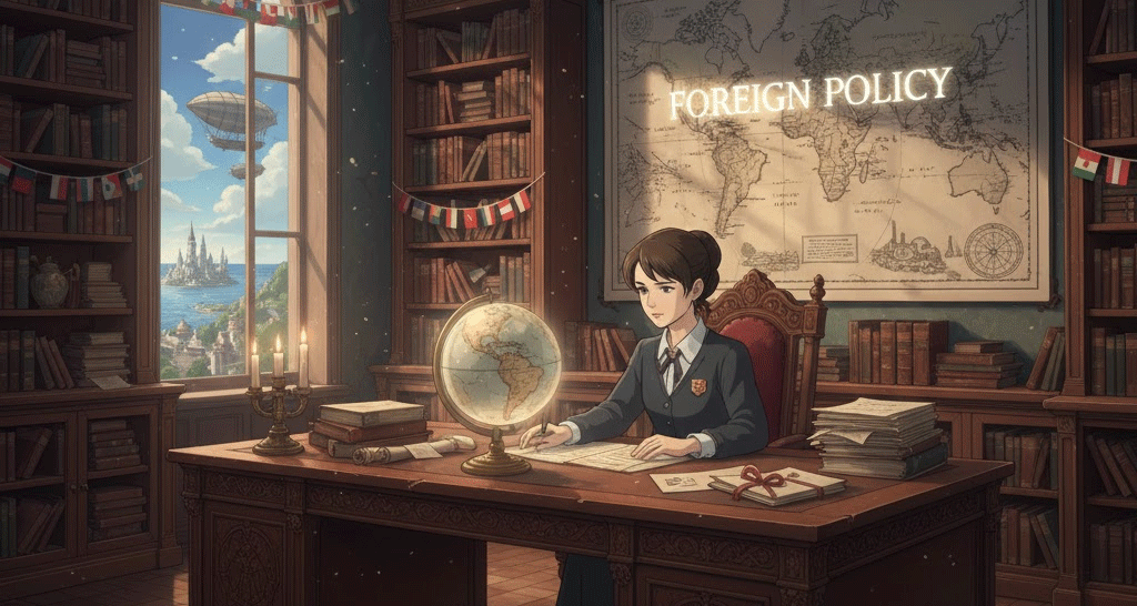 - 해석: 한 국가가 다른 국가나 국제 기구와 관계를 맺고 상호 작용하는 방식에 대한 전략과 방침.