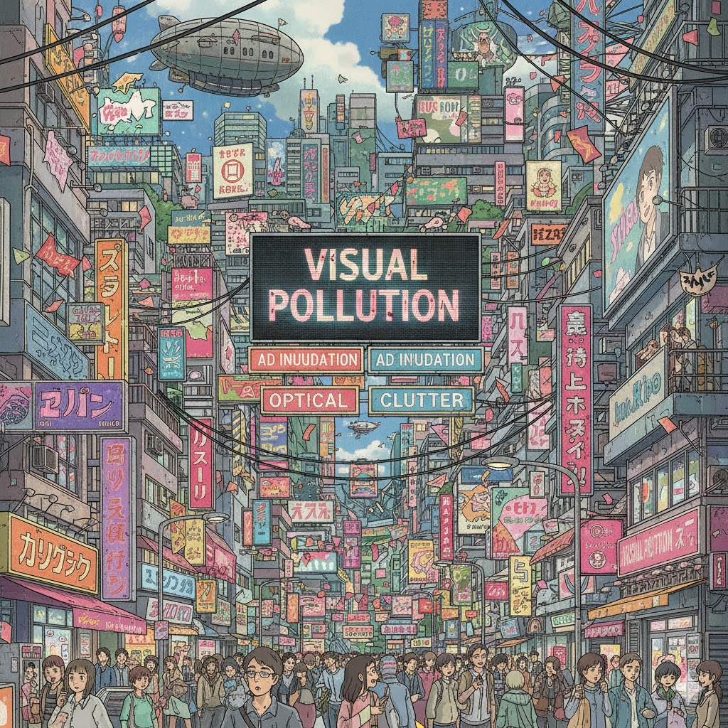 - 해석: 무질서하거나 보기 흉한 광고판, 전선, 건물 등이 경관을 해쳐 시각적 환경의 질을 저하시키는 상태.