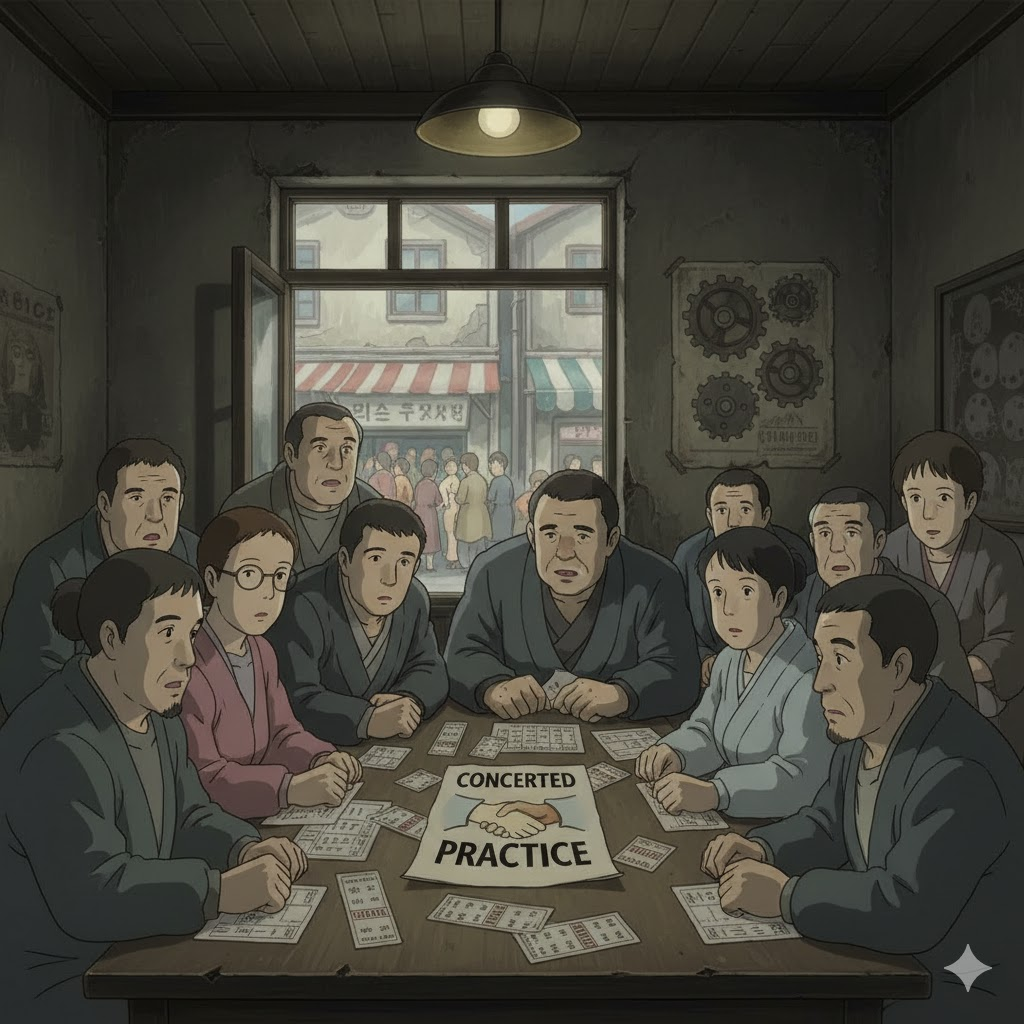 - 해석: 경쟁 관계에 있는 기업들이 공식적인 합의 없이도 서로 보조를 맞춰 가격, 생산 등을 결정하는 불법적인 관행.