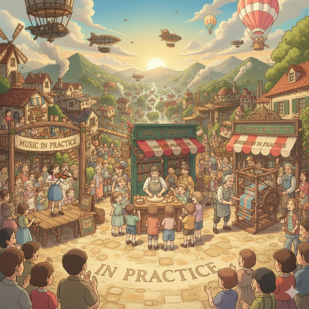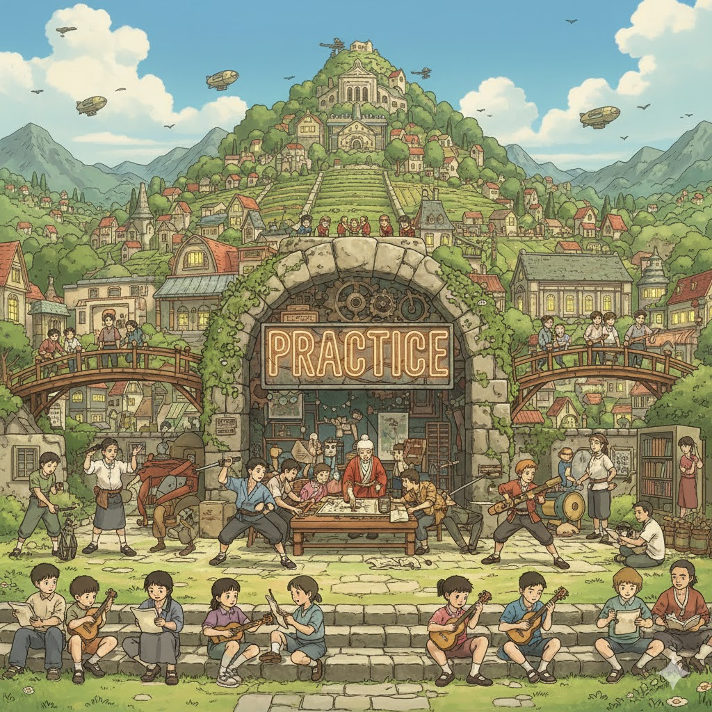 연습, 실행, 숙련도. 기술을 얻기 위한 반복 훈련, 이론의 실행, 그리고 실력의 상태.