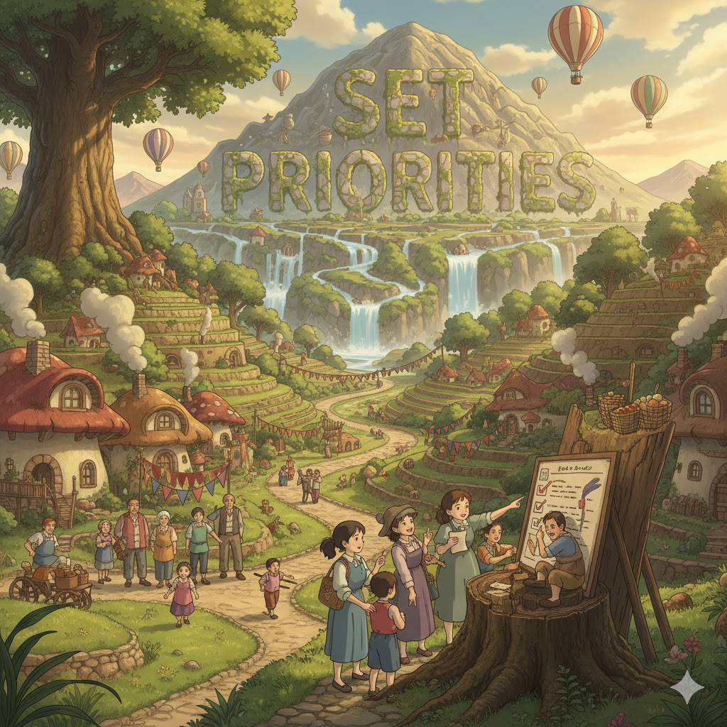 - set priorities는 제한된 자원(시간, 돈, 인력)을 가장 중요한 목표에 집중하여 효율성(efficiency)을 극대화하는 합리적 의사 결정의 과정을 의미합니다. 지문은 긴급성과 중요성을 구분하여 진정한 우선순위를 설정하는 아이젠하워 매트릭스와 같은 전략의 중요성을 강조합니다.