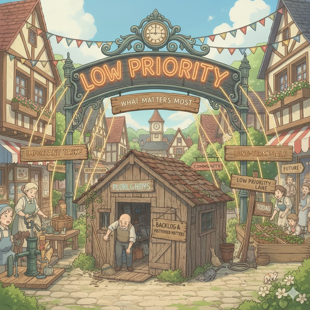 '다른'(other) '긴급'(urgent)하거나 '중요'(important)한 '임무'(tasks)에 '비해', '상대적'(relatively)으로 '덜'(less) '중요'하거나 '시간'(time) '제한'(deadline)이 '느슨한'(flexible) '대상'을 의미합니다. '나중'(later)으로 '미루거나'(postpone) '최소한'(minimum)의 '자원'(resources)만 '할애'(allocate)해도 '좋은'(fine) '사안'을 강조합니다.